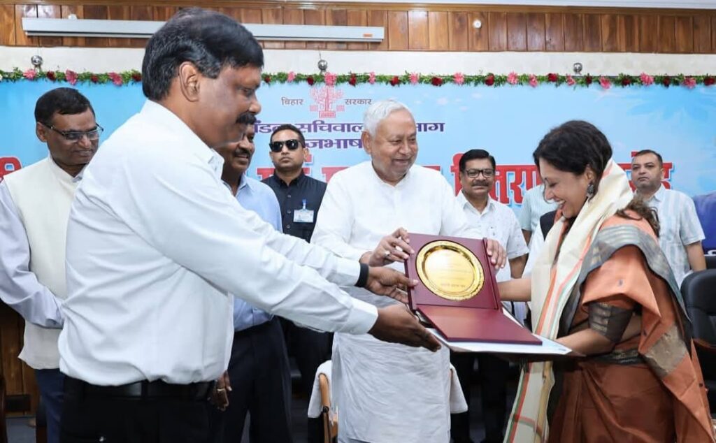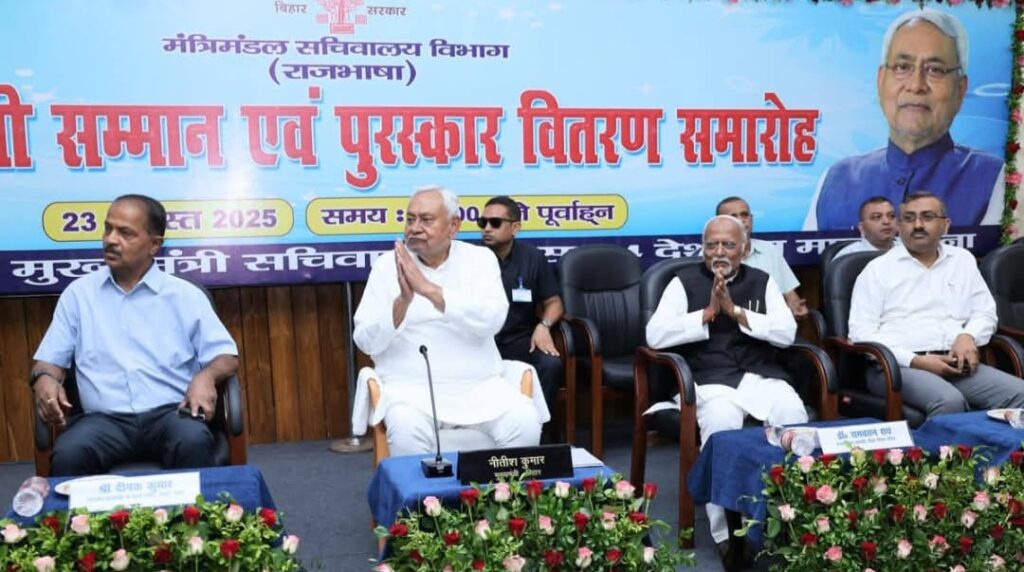 मुख्यमंत्री नीतीश कुमार ने पटना स्थित मुख्यमंत्री सचिवालय के संवाद में आयोजित हिंदी सेवी सम्मान एवं पुरस्कार वितरण कार्यक्रम में शामिल हुए। कार्यक्रम के दौरान मुख्यमंत्री ने हिन्दी सेवी सम्मान एवं पुरस्कार (2023-24) के अधीन विभिन्न श्रेणियों के लिये अखिल भारतीय स्तर पर चयनित तथा इस समारोह में उपस्थित 12 साहित्यकारों / संस्थाओं को पुरस्कृत किया। पुरस्कार प्रदान करने के पश्चात् मुख्यमंत्री ने सभी पुरस्कार विजेताओं को हार्दिक बधाई एवं शुभकामनायें देते हुये उनके उज्ज्वल भविष्य एवं स्वस्थ जीवन की कामना की।