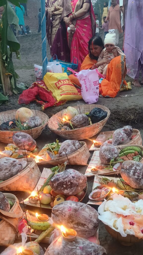 गंगा तट से लेकर गांवों के छोटे तालाबों तक छठ गीतों की मधुर गूंज सुनाई दी — “कांचा ही बांस के बहंगिया…” और “उग हो सूरज देव…” जैसे गीतों ने पूरे वातावरण को भक्ति से भर दिया। महिलाएं पारंपरिक वेशभूषा में सजे फल, ठेकुआ, नारियल और पांच तरह के फल से सजी डाली लेकर घाटों पर पहुंचीं।