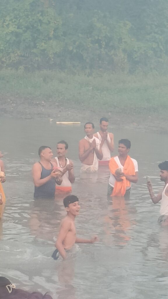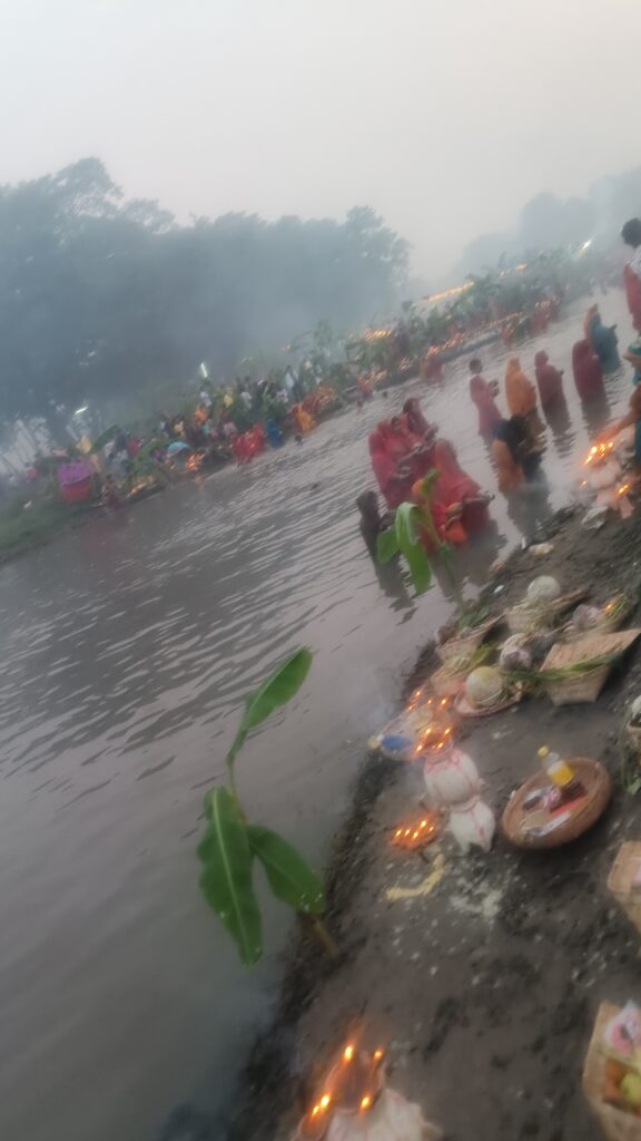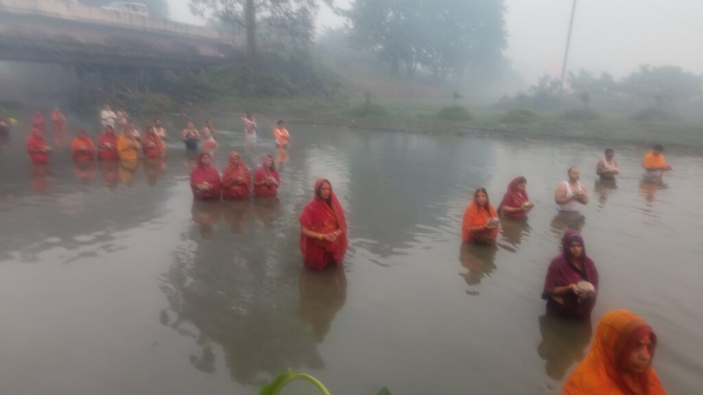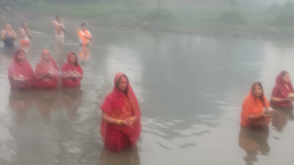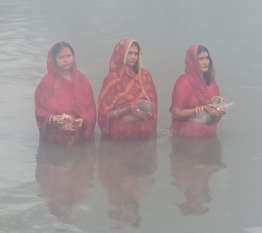 व्रतियों ने सूप में ठेकुआ, केला, नारियल, सिंघाड़ा, सेब और अन्य प्रसाद सजाकर नदी के निर्मल जल में खड़े होकर सूर्य देव को नमन किया। इस दौरान पूरे वातावरण में छठ गीतों की मधुर गूंज सुनाई दी — “उग हो सूरज देव भइली अरघ के बेला…”
