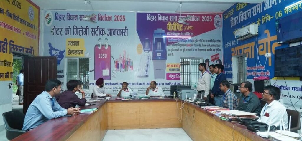 आगामी बिहार विधानसभा आम निर्वाचन 2025 के सफल, निष्पक्ष एवं शांतिपूर्ण संचालन की तैयारी के तहत दिनांक 30 अक्टूबर 2025 को समाहरणालय, मधेपुरा स्थित जिला नियंत्रण-कक्ष का संयुक्त निरीक्षण किया गया। इस निरीक्षण में जिला निर्वाचन पदाधिकारी-cum-जिला पदाधिकारी श्री तरनजोत सिंह, आरक्षी अधीक्षक मधेपुरा श्री संदीप सिंह सहित जिले के सभी चारों विधानसभा क्षेत्रों के सामान्य प्रेक्षकगण उपस्थित रहे। इस अवसर पर उपस्थित सामान्य प्रेक्षक थे 70-आलमनगर विधानसभा क्षेत्र के सामान्य प्रेक्षक – श्री रघुराज एम. आर. (IAS), 71-बिहारीगंज विधानसभा क्षेत्र के सामान्य प्रेक्षक श्री नवीन कुमार सिंह (IAS),