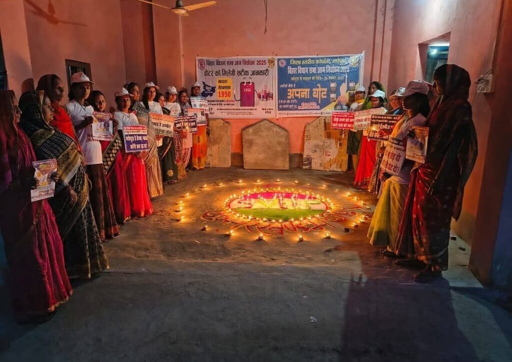 बिहार विधानसभा आम निर्वाचन 2025 के अवसर पर मतदाता जागरूकता अभियान (SVEEP) के तहत आज सूरज जीविका सी.एल.एफ. के तत्वावधान में रानीपट्टी सुखासन पंचायत, प्रखंड कुमारखंड में एक विशेष कार्यक्रम का आयोजन किया गया। कार्यक्रम की शुरुआत दीप प्रज्वलन और आकर्षक रंगोली निर्माण से हुई, जिसने मतदाता जागरूकता को एक सांस्कृतिक और भावनात्मक रंग प्रदान किया। जीविका दीदियों ने उपस्थित ग्रामीण महिलाओं एवं युवतियों को मतदान के महत्व, प्रक्रिया एवं उसकी गोपनीयता के बारे में विस्तारपूर्वक जानकारी दी। सभी से अपील की गई कि आगामी 6 नवंबर को अपने मताधिकार का प्रयोग अवश्य करें और लोकतंत्र के इस पर्व में अपनी सशक्त भागीदारी दर्ज कराएँ। इस अवसर पर सूरज सी.एल.एफ. की अध्यक्ष श्रीमती कुंती देवी, जीविका मित्र एवं कई महिला समूहों की दीदियाँ उपस्थित थीं। कार्यक्रम के दौरान दीदियों ने सामूहिक शपथ लेकर 100% मतदान सुनिश्चित करने का संकल्प भी लिया।