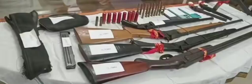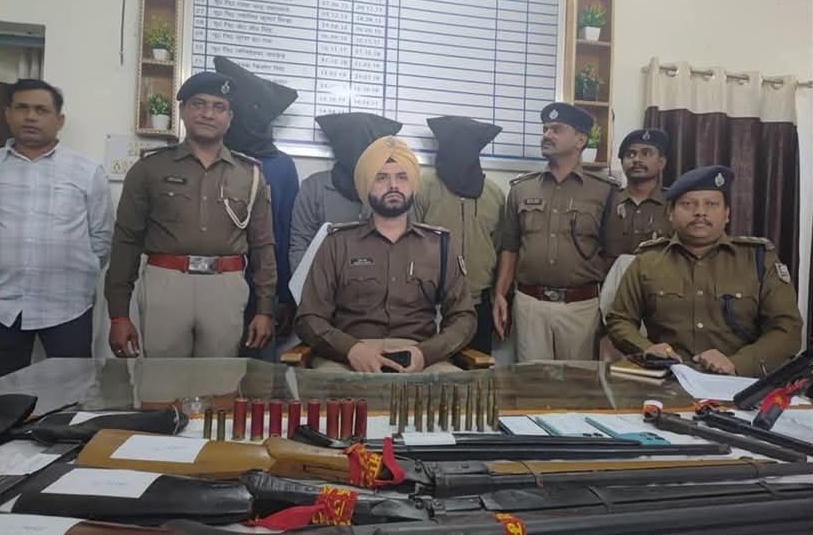 उदाकिशुनगंज थाना क्षेत्र के शाहजादपुर गांव में गत दिनों विराट कुमार सिंह नामक एक युवक हाथ में अवैध हथियार व एक देशी कारबाईन लहड़ाये जाने का वीडीयो वायरल किया था।जिसकी सूचना उदाकिशुनगंज पुलिस ने जिला आसूचना इकाई को उपलब्ध कराया गया। जिसका सत्यापन एवं आवश्यक कार्रवाई करने हेतु पुलिस अधीक्षक संदीप सिंह के द्वारा एसडीपीओ अविनाश कुमार के नेतृत्व में उदाकिशुनगंज थानाध्यक्ष सुधाकर कुमार , पुअनि विक्की रविदास, पुअनि रमेश प्रसाद यादव, जिला आसूचना इकाई की टीम समेत सशस्त्र बलों की एक टीम गठित कर वायरल वीडियो के आधार पर थाना क्षेत्र के शाहजादपुर, वार्ड संख्या 4 के चंद्रहास सिंह के पुत्र विराट कुमार सिंह के घर पर छापेमारी किया। छापेमारी के दौरान विराट कुमार सिंह को गिरफ्तार कर पुछताछ किया तो बताया कि वायरल कारबाईन मैं अपने दोस्त नयानगर पंचायत के वार्ड संख्या 13 निवासी विरेन्द्र प्रसाद सिंह के पुत्र अजय कुमार सिंह उर्फ छोटू सिंह एवं गोपाल कुमार सिंह के पुत्र अमन कुमार सिंह के साथ आलमनगर के रतवाड़ा थाना क्षेत्र के बड़गांव निवासी पवन कुमार सिंह से लेकर बेचने के लिए लाये थे।जिसे तत्काल नयानगर के अजय कुमार सिंह उर्फ छोटू सिंह के घर में छुपा कर रखे हुए हैं।तब पुलिस टीम ने गिरफ्तार विराट कुमार सिंह को अपने साथ में लेकर नयानगर पहुंचा तो अजय कुमार सिंह उर्फ छोटू सिंह के घर पर छापेमारी किया तो भारी मात्रा में अवैध हथियार व कारतूस बरामद हुआ। एसपी संदीप सिंह ने मंगलवार को उदाकिशुनगंज थाने में गिरफ्तार तीनों युवक के पास से बरामद अवैध हथियार व कारतूस का पीसी करते हुए पत्रकारों को बताया कि पुलिस ने देशी कट्टा 2, देशी दो नाली बंदूक 1, देशी मासकेट 1, देशी रायफल 2, देशी कारबाईन मैगजीन सहित 1,कारबाईन का खाली मैगजीन 1,एक विंडोलिया जिस्म 17 जिंदा कारतूस,काला रंग के बैग में 5 जिंदा कारतूस व खोखा 5 एवं एंड्रॉयड मोबाइल 3 बरामद किया गया है। पुलिस इसे बहुत बड़ी सफलता मान रही है। छापेमारी दल में थानाध्यक्ष सुधाकर कुमार, पुअनि विक्की रविदास, पुअनि रमेश प्रसाद यादव, जिला आसूचना इकाई टीम के अलावे थाने के सशस्त्र पुलिस बल शामिल थे।