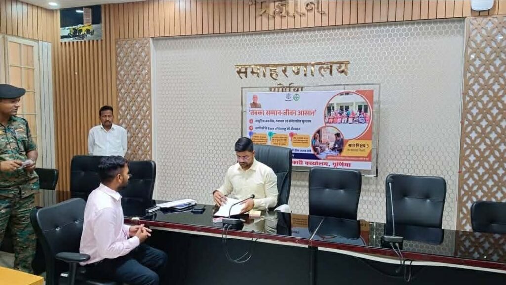 जिला पदाधिकारी श्री अंशुल कुमार (भा०प्र०से०) द्वारा सेवा- संवाद-समाधान अनुश्रवण प्रणाली के तहत सबका सम्मान-जीवन आसान (Ease of Living) कार्यक्रम के तहत सोमवार को समाहरणालय स्थिति प्रज्ञान सभागार में आमजनों से सीधे संवाद स्थापित कर उनकी समस्याओं को गंभीरतापूर्वक सुना गया और संबंधित पदाधिकारियों को अंग्रेतन कार्रवाई करने का निर्देश दिया गया। कार्यक्रम के दौरान जिले के विभिन्न प्रखंडों एवं पंचायतों से आए व्यक्तियों द्वारा कुल-22 आवेदन विभिन्न विभागों से संबंधित देकर अपनी-अपनी समस्याएं जिला पदाधिकारी के समक्ष रखीं।जिलाधिकारी द्वारा त्वरित कार्रवाई के लिए संबंधित विभागीय अधिकारियों को निर्देश दिया गया। उक्त के अतिरिक्त कार्यक्रम के तहत प्रखंड अनुमंडल एवं विभिन्न विभागों के पदाधिकारियों ने भी अपने-अपने कार्यालय में उपस्थित होकर आए लोगों की समस्याएं सुनीं तथा उनके समाधान के लिए आवश्यक कदम उठाए। ज्ञातव्य हो कि उक्त कार्यक्रम का आयोजन प्रत्येक सोमवार और शुक्रवार को जिला मुख्यालय एवं अनुमंडल तथा प्रखंड एवं पंचायतों में संबंधित अधिकारियों द्वारा नियमित रूप से किया जा रहा है। किसी भी प्रकार की सहायता या सूचना के लिए आपदा प्रबंधन कार्यालय के जिला नियंत्रण कक्ष के दूरभाष संख्या:–064 54-